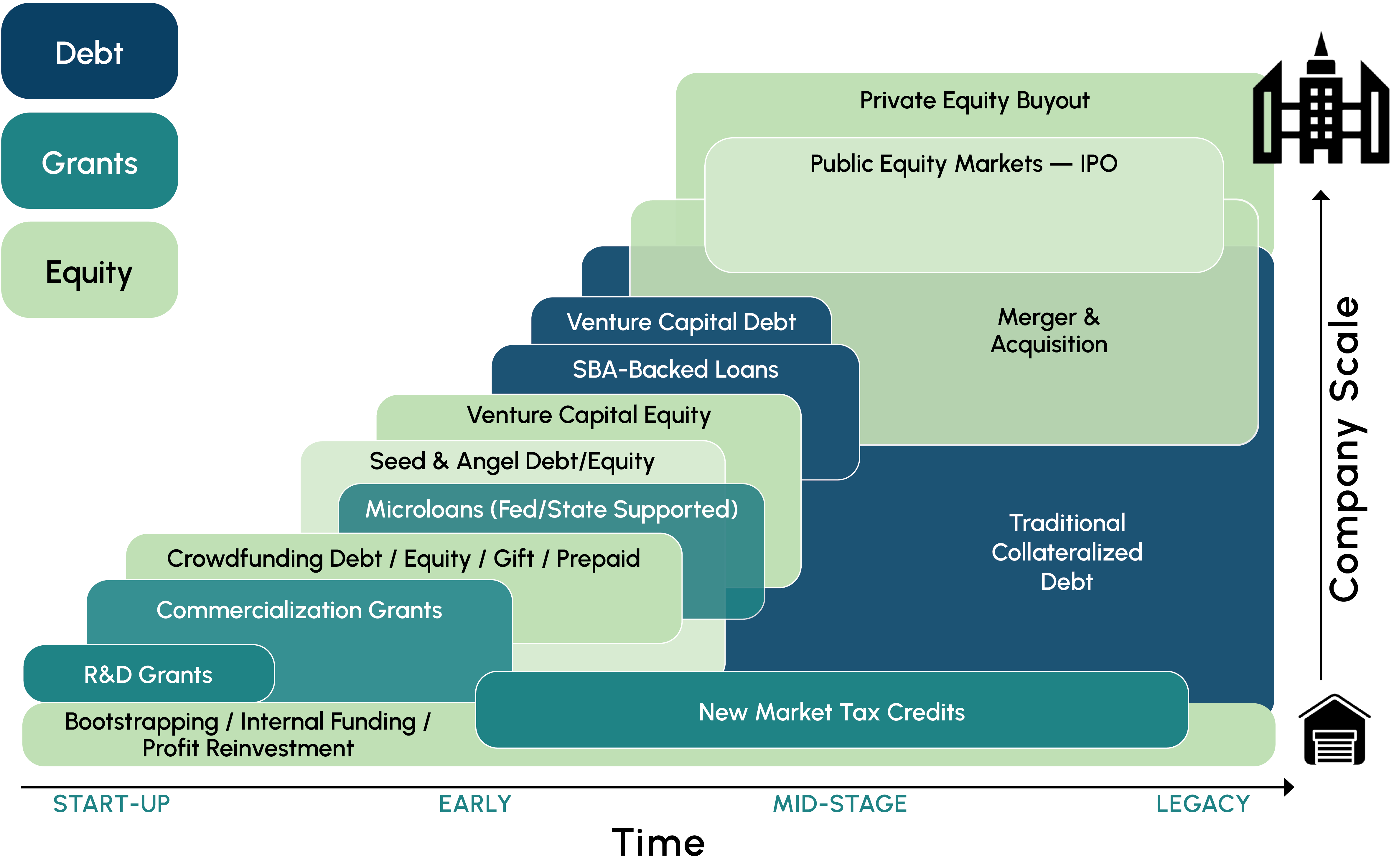 Together, these layers of capital form a continuum, with each step on the ladder representing both the growth of a business and the increasing sophistication of the capital available to it.